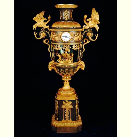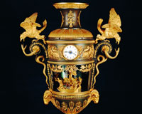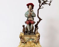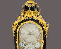 La caja de madera de este reloj, recubierta con plantas de metal dorado y embellecida con incrustaciones, está decorada con un conjunto de autómatas. Fue una importante adquisición realizada por el rey Fernando VI al relojero suizo Pierre Jaquet-Droz. Destaca por este original diseño con autómatas e inauguró una nueva etapa en la relojería suiza.