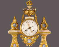 Los relojes de tipo "pórtico" fueron muy apreciados a finales del siglo XVIII y responden al gusto neoclásico que triunfó en el reinado de Carlos IV. La fuente de inspiración está en la arquitectura griega y romana, y la ornamentación es la habitual al estilo (columnas, guirnaldas, etc.). Solía emplearse el mármol para la estructura de la caja y el bronce en la ornamentación, y se embellecían con medallones de porcelana de Sévres o biscuit de Wedgwood.