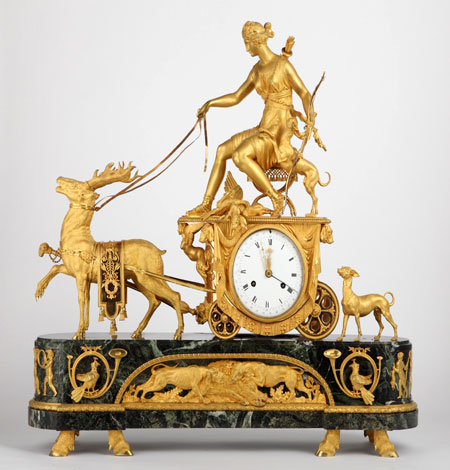 En julio de 1796, el marchand-mercier de Carlos IV, François-Louis Godon presentó una cuenta por varias alhajas traídas desde París para la Real servidumbre. Entre los relojes se encontraba «una péndula que representa a Diana». Este reloj, cuya caja reproduce el tema de Diana cazadora, responde a las características técnicas y artísticas de los relojes de escuela francesa de finales del siglo XVIII. Las cajas que combinaban mármol y bronce fueron sustituidas a comienzos del siglo XIX por cajas fabricadas enteramente en bronce dorado. La utilización de materiales, su disposición y la calidad del dorado nos recuerda a la de otro reloj, firmado por Godon, destinado también a decorar uno de los salones de la Casa del Labrador, cuya caja representa el tema de Deméter enseñando a Triptólemo el arte del arado.